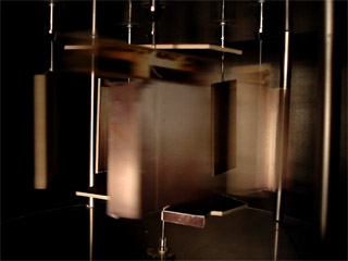 A model of the gallery space (Golden Pudel Club) on a scale 1:30 with alternately rotating units. The units movement follow an inaudible musical choreograpie.